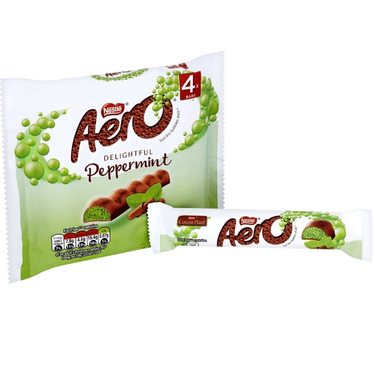 Aero Peppermint Bubble Bar is a new addition to the Aero Chocolate Bar family, featuring real peppermint flavour with the signature bubbly texture, covered in milk chocolate. Feel the bubbles of AERO melt in your mouth. Made with natural flavours, using vanilla and a touch of real peppermint. Package comes with 4 bars.