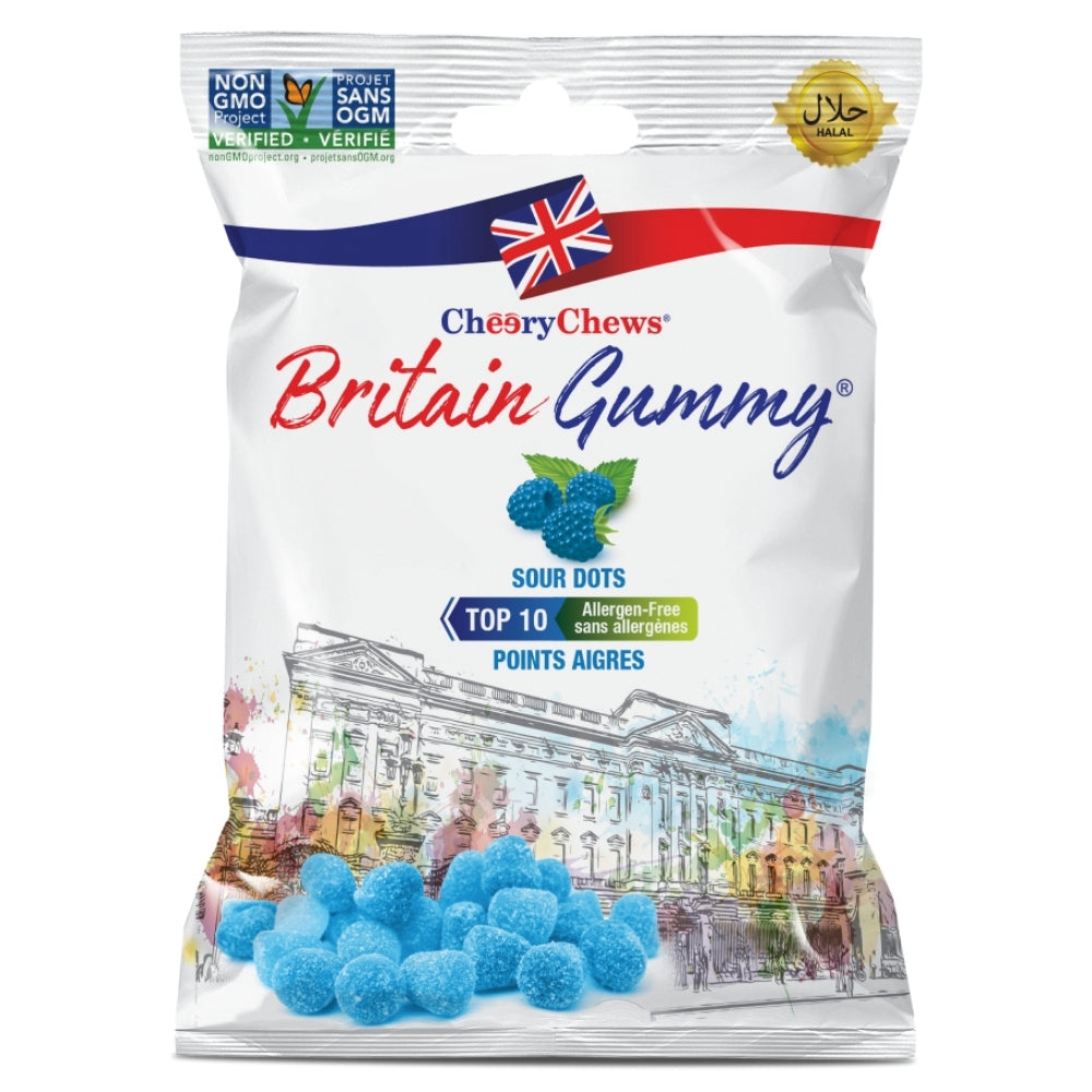 Sour, blue raspberry and a gummy? You can't go wrong. Britain Gummy Sour Dots are just as sour, sweet and sugary as you can imagine. Made with all-natural fruit juice and free of the top 10 allergens these little sour gummies are the perfect treat.