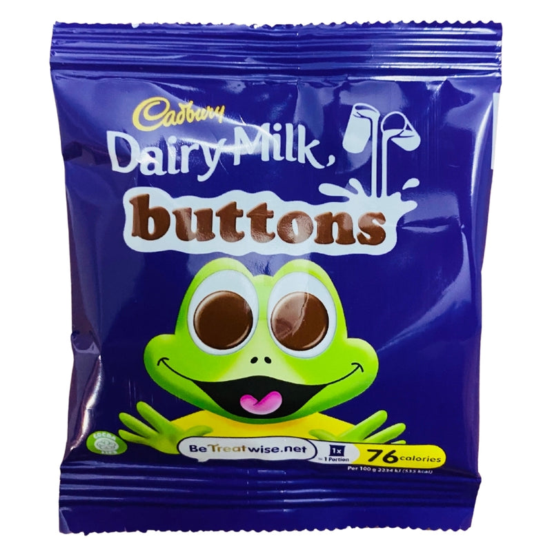 Buttons are your favourite Cadbury Milk chocolate but in sweet circle shapes. Packaged in little bags, they're bags of fun and as cute as a giggle! First made in 1960, they've been a staple in Cadbury's chocolate line and are made with quality Fair trade cocoa and fresh milk.