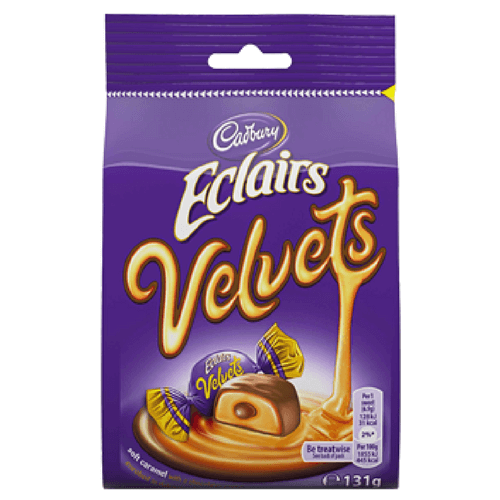 Cadbury Eclairs Velvets are delicious, soft caramels with a luscious liquid chocolate center covered in scrumptious Cadbury milk chocolate. Suitable for vegetarians