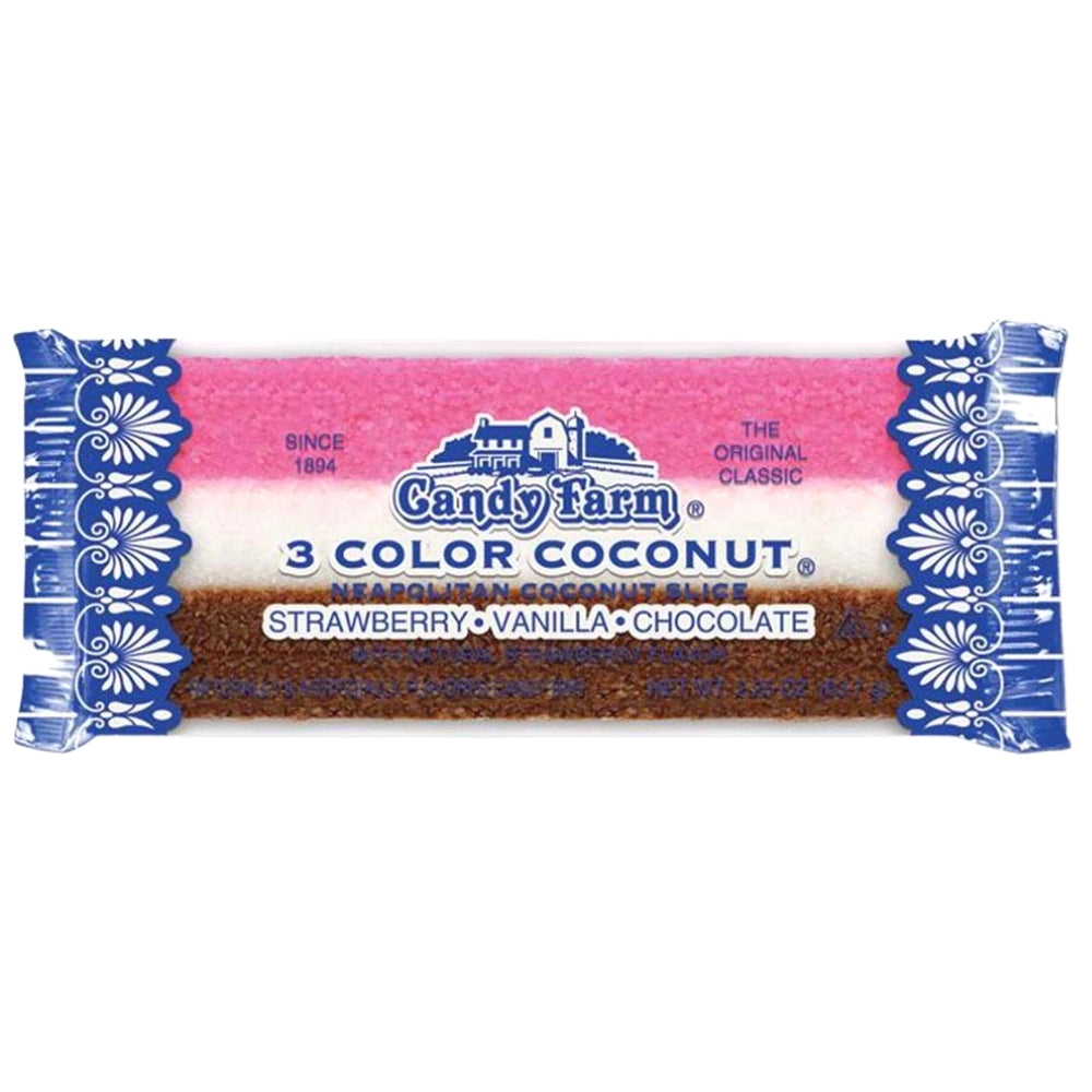 The Candy Farm 3 Colour Coconut Neapolitan Slice is a moist and chewy coconut candy bar. This triumphant-tasting tri-coloured bar comes in the classic flavours of Strawberry, Chocolate and Vanilla! Loved and enjoyed since 1894, this classic candy has been "a slice" for over a century!