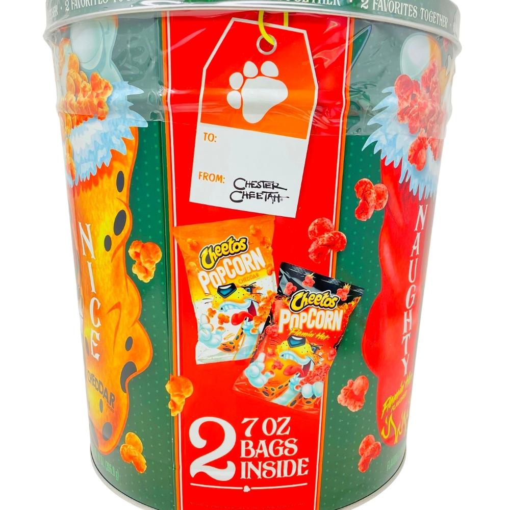 Chester is here with an awesome holiday gift! Enjoy a Christmas-themed gift tin with 2 of your favourite Cheetos inside: Cheetos Popcorn Flamin' Hot (7 oz) and Cheetos Popcorn Cheddar (7oz). Open the bags and mix these two together inside in the tin for a perfect Cheetos munchies experience.