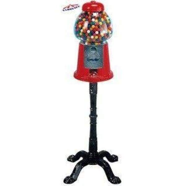 A truly beautiful retro, classic gumball machine bank complete with a stand that is sure to make the eyes of the kid in everyone widen with pure joy and excitement! This authentic piece is constructed of quality die-cast metal base and cap with detailed carousel engravings on the front dispenser, with the rest painted the most perfect, bold red, and features a real glass globe. It also includes a die-cast metal stand that brings it up to 37" tall! This machine is great for home, office, or the dorm, holding up to 5 lbs. of gumballs, peanuts, or other candy, and accepts pennies, nickels, dimes, quarters, or can be adjusted for free dispensing! A beautiful piece that adds fun to wherever is stands!