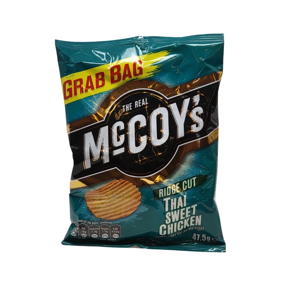Thick crinkle-cut crips loaded with flavour. Try The Real McCoy's Thai Sweet Chicken, so sweet you'll eat the whole bag. A strong sweet chilli flavour and a soft heat. Accept No Imitations.