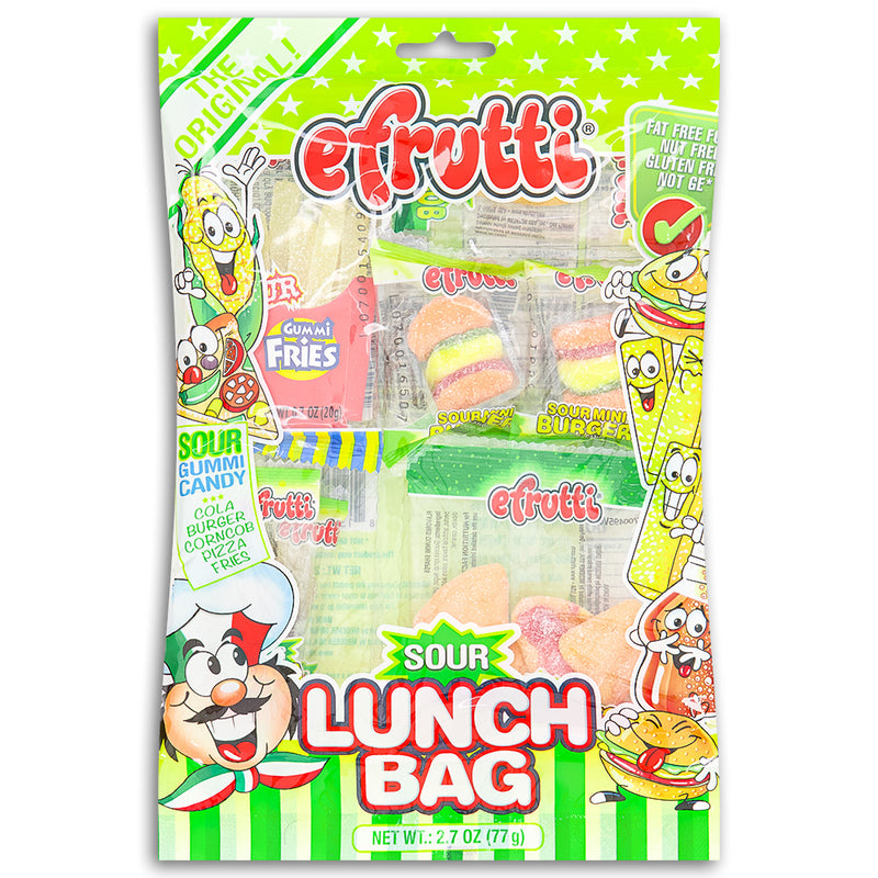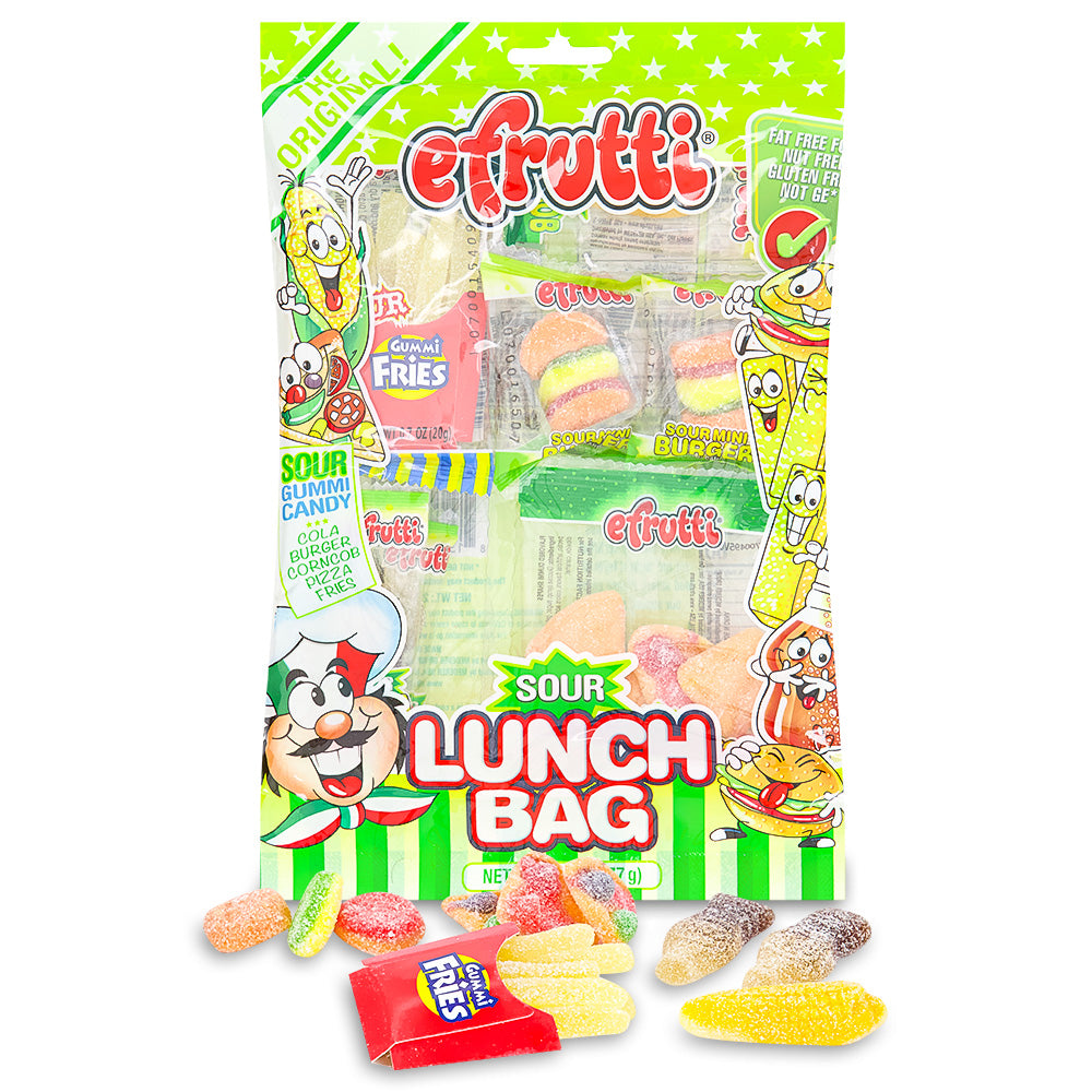 Taking the eFrutti Sour Lunch Bag to work, school, or play will make you so adored, complete with sour candy burgers, fries, cola bottles, pizza slices, and a corncob! Why? Because candy is sweet and you are what you eat. True fact. Our Fun-gineers did the research and found that Sweeties were much happier with the eFrutti Lunch Bag than a bologna sandwich. You be the judge!