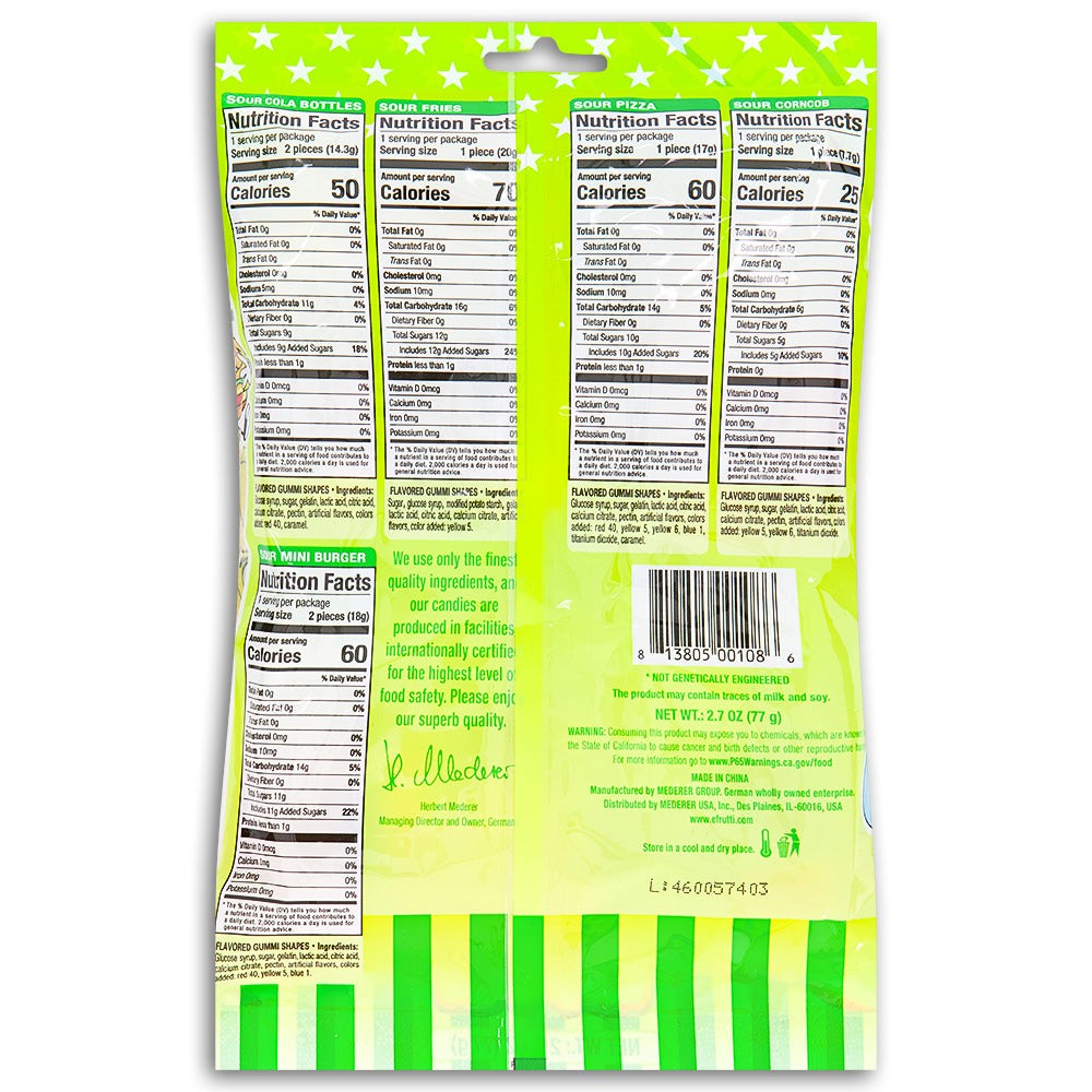Sour Mini Burger: Glucose syrup, sugar, gelatin, lactic acid, citric acid, calcium citrate, pectin, artificial flavors, colors added: red 40, yellow 5, blue 1.