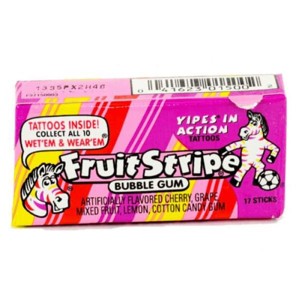 Fruit Stripe Bubble Gum is the zebra striped gum you remember from the 1960's. Too young you say? Then you're in very a very sweet and cool treat. This is the only bubblegum with zebra stripes. Flavours include Cherry, Grape, Mixed Fruit, Lemon and Cotton Candy. Sweet Times Do Live Here!