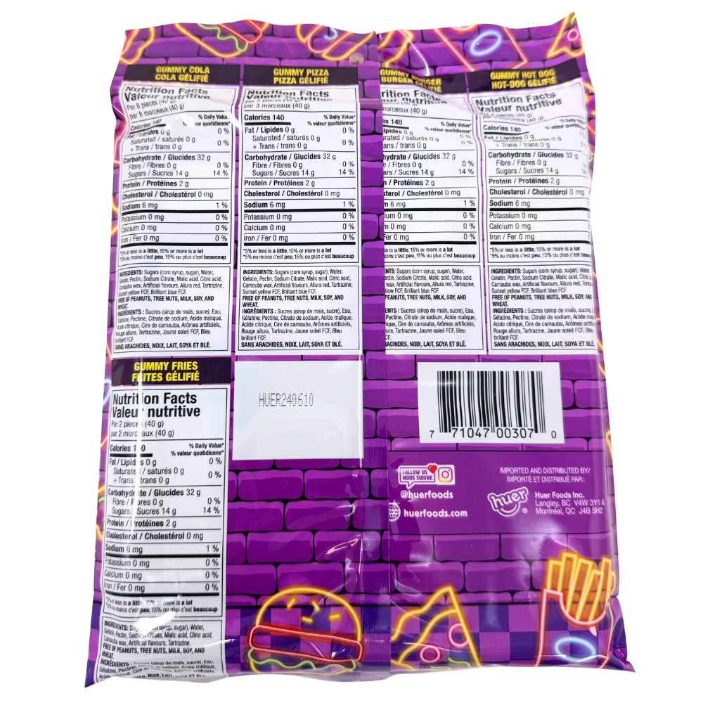 As you open this gummy candy, you'll find a gummy pizza complete with all the toppings, a yummy gummy hot dog, a refreshing gummy gulp of cola, some salty gummy candy fries, and a stacked hamburger gummy! With these superb and sweet candies, every salty yearning will be more than fulfilled.