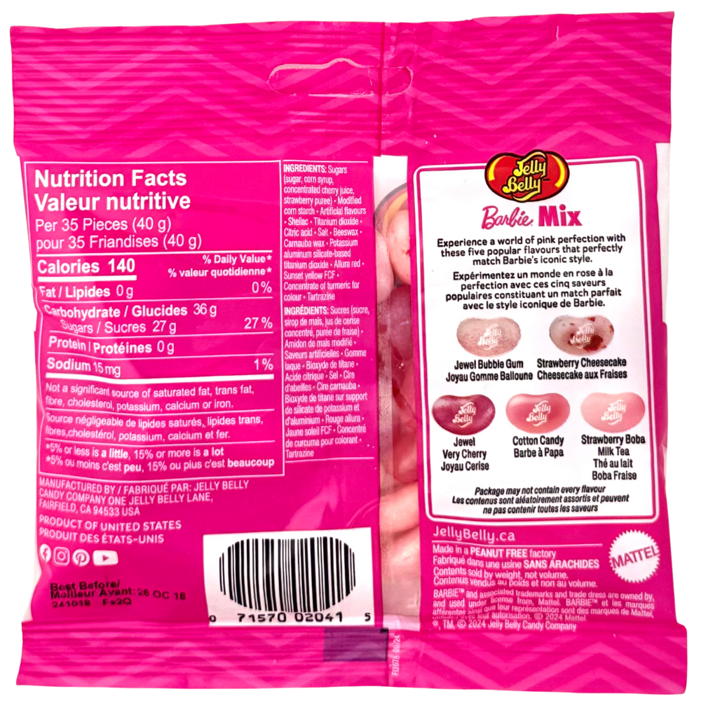 Our pal Barbie is a huge Jelly Belly fan! This mix includes the flavours of cotton candy, strawberry boba, jewel very cherry, jewel bubble gum, and strawberry cheesecake. These sweet beans are made in tones of pink and will hit the sweet spot anytime!