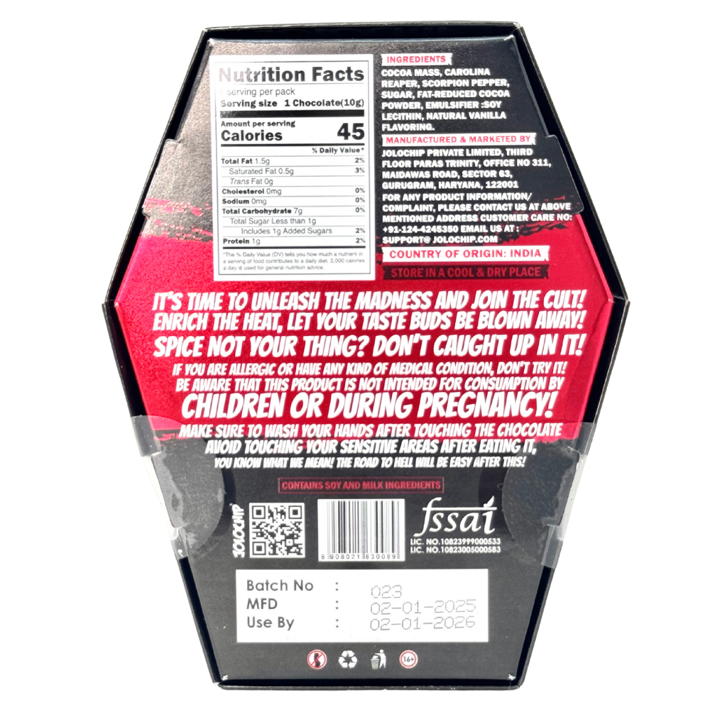 Go down in a blaze of glory with this challenge! Featuring a velvety dark chocolate infused with some of the hottest peppers known to man! Bite through the heat of the Carolina Reaper, a Ghost Pepper and the Trinidad Scorpion. You might be thinking the slight sweetness of the chocolate will take the edge off; think again! Brace yourself for an inferno!