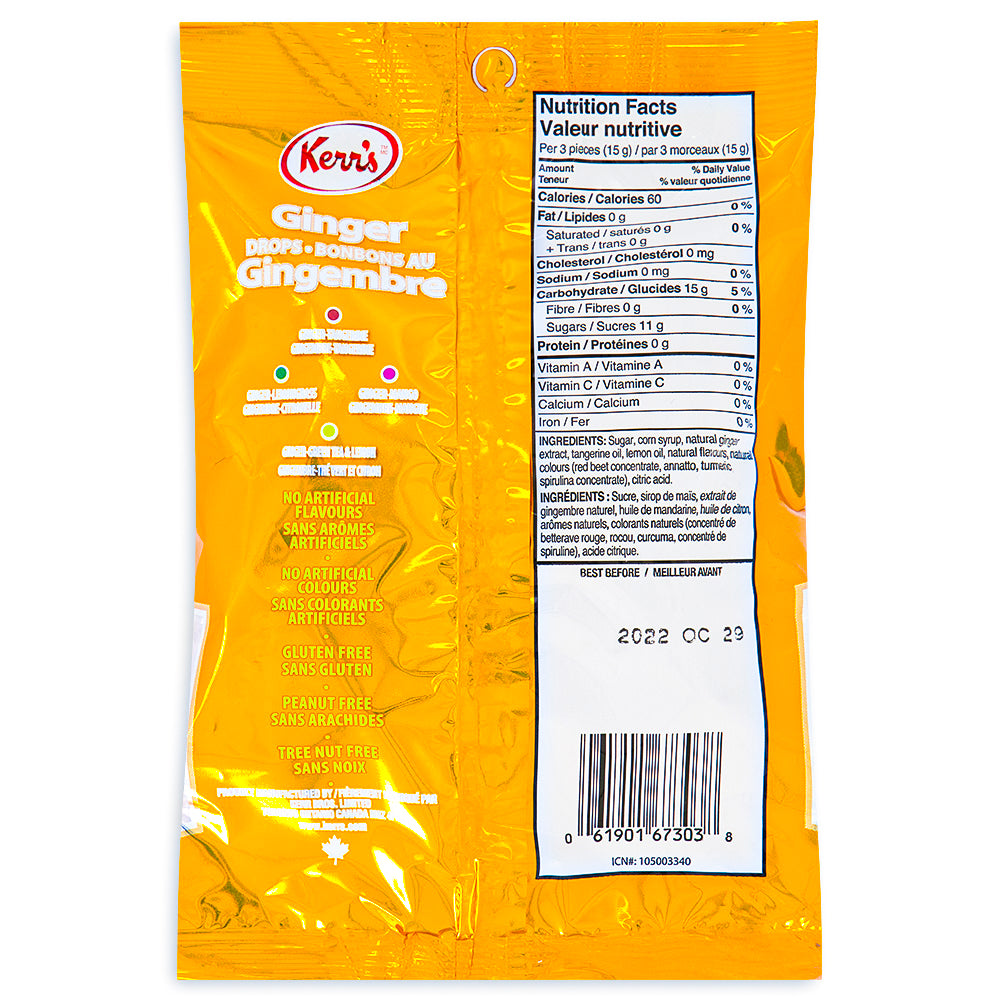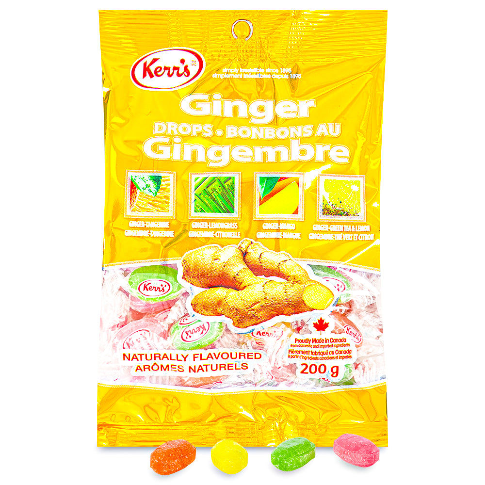 Kerr's Ginger Drops are delicious and spicy hard candies! These classic Canadian Candies are made with natural ginger extract, natural tangerine and lemon oil. Only natural colours and flavours. No high fructose corn syrup and no modified or hydrogenated fats or oils are used in this fine candy!