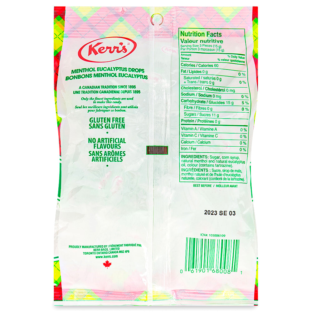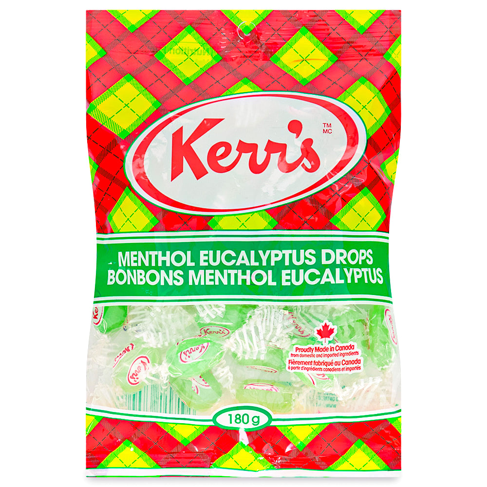Kerr's Classic Tartan Menthol Eucalyptus Drops are naturally flavoured with menthol crystals and eucalyptus oil. These delicious candies contain no high fructose corn syrup and no modified or hydrogenated fats or oils!