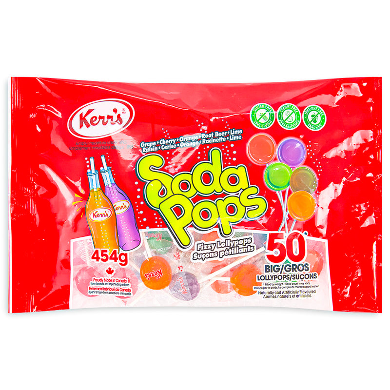 Kerr's Soda Pops Lollypops are fizzy! This assortment of fizzy soda lollipops comes in 5 yummy flavours of orange, cherry, lemon/lime, grape and root beer. These fantastic lollipops contain no high fructose corn syrup and no modified or hydrogenated fats or oils! Eat better candy!