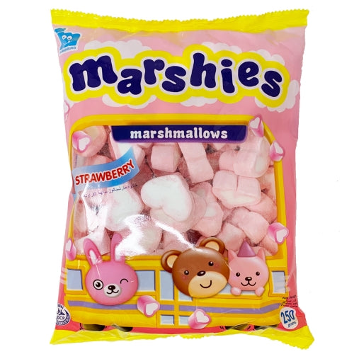 Strawberry Marshies are a form of deliciously sweet, classic pillow-y marshmallow in a strawberry flavour! They are a Halal version fit for everyone to enjoy, in a cute and fun pink heart shape! They would make a great addition to any candy buffet for a girl's baby shower or first birthday!
