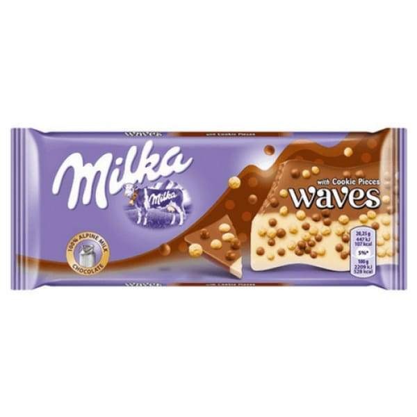 Milka Chocolate Waves are made of 100% Alpine milk chocolate with cookie pieces.