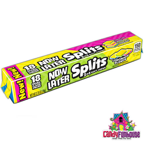 Now & Later Splits Lemonade Blends are double the tasty fun. Already having a hard time deciding to eat them Now or Later? Now you have to choose from these assorted lemonade blends of Lemon-Lime, Lemon-Strawberry & Lemon-Blue Raspberry.
