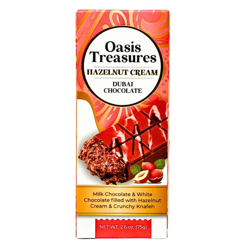This is just the treasure you've been searching for! The Oasis Treasures Hazelnut Cream Dubai Chocolate is a one-of-a-kind chocolate indulgence!