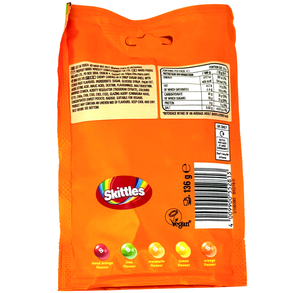 Blood orange, lemon, lime, orange, and mandarin flavours are perfectly captured and candified like only Skittles can!