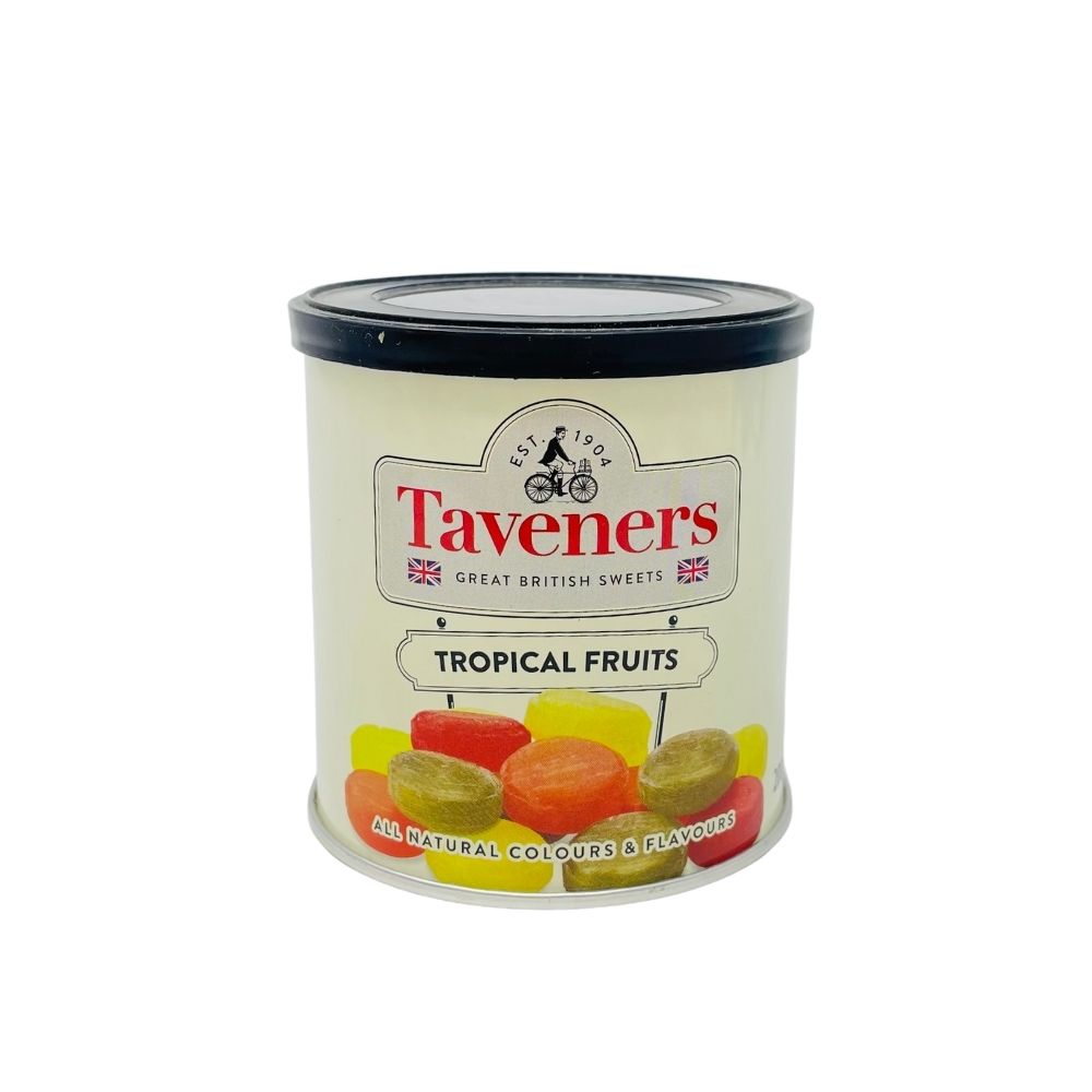 Taveners Tropical Fruit Drops come in a convenient stay-fresh travel tin. Proper boiled sweets that come in the delicious flavours of lime, grapefruit, lemon, and orange.