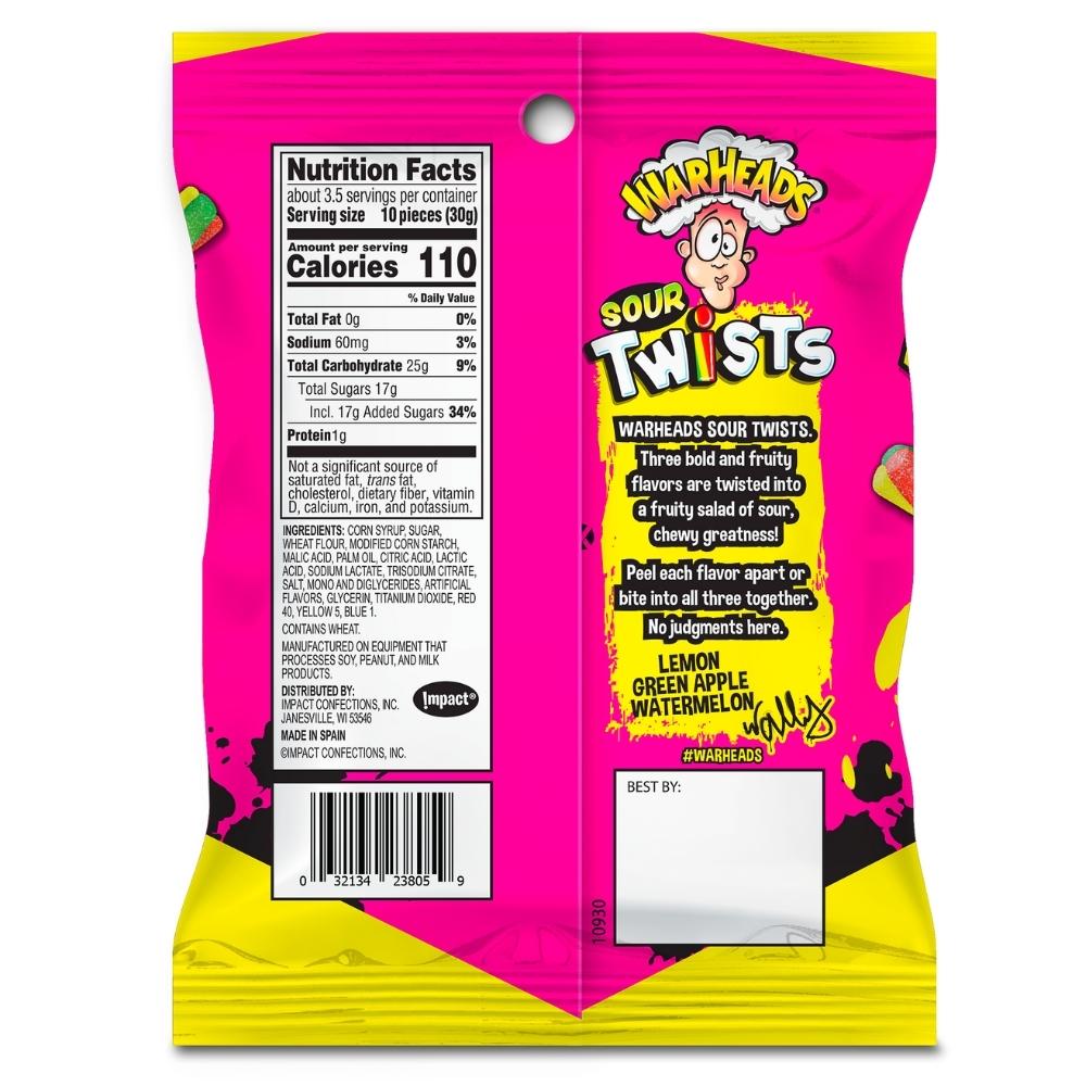 Get ready to "Twist and shout"! These colourful, sour twists will have you dancing for joy with their delicious combination of flavours. Warheads Sour Twists Candy are a trio of sourness with watermelon, green apple and lemon all combined into a colourful chewy concoction! Grab a handful and indulge in this incredibly sour treat today!